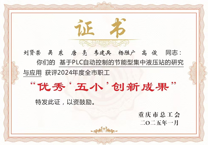 2025年1月17日,重慶市總工會成功舉辦了2024年度重慶市勞模和工匠人才創(chuàng)新工作室十大攻關(guān)成果及職工優(yōu)秀“五小”(小發(fā)明、小創(chuàng)造、小革新、小設(shè)計、小建議)活動創(chuàng)新成果發(fā)布會。本次活動吸引了115個勞模攻關(guān)成果以及944個“五小”創(chuàng)新成果踴躍報名參賽。經(jīng)過重慶市總工會的嚴格篩選和層層評審,最終評選出“十大攻關(guān)成果”以及50個職工優(yōu)秀“五小”創(chuàng)新成果。其中,渝江壓鑄憑借出色的表現(xiàn),榮登“優(yōu)秀五小創(chuàng)新成果”榜單,“劉賢榮、吳東、唐亮、韋建兵、楊勝廣、高俊”團隊研發(fā)的“基于PLC自動控制的節(jié)能型集中液壓站的研究與應(yīng)用”項目成功斬獲殊榮,在此,我們向獲獎同仁致以最熱烈的祝賀!期待他們在未來的日子里,再接再厲,勇攀高峰,創(chuàng)造更多的輝煌。